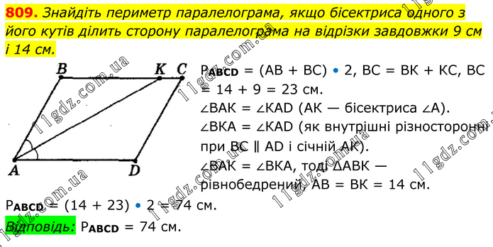 Знайдіть периметр паралелограма, якщо бісектриса одного з його кутів ділить сторону паралелограма на відрізки завдовжки 9 см і 14 см. РАBCD = (АВ + ВС) • 2, ВС = ВК + КС, ВС = 14 + 9 = 23 см. ∠ВАК = ∠КАD (АК — бісектриса ∠А). ∠ВКА = ∠КАD (як внутрішні різносторонні при ВС ∥ АD і січній АК). ∠ВАК = ∠ВКА, тоді ∆АВК — рівнобедрений, АВ = ВК = 14 см. РАВСD = (14 + 23) • 2 = 74 см. Відповідь: РАВСD = 74 см.