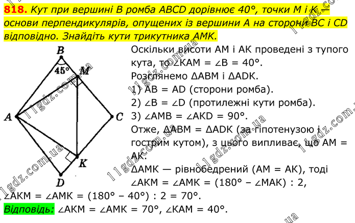 Kут при вершині В ромба ABCD дорівнює 40°, точки M i K — основи перпендикулярів, опущених із вершини А на сторони BC і CD відповідно. Знайдіть кути трикутника AMK. Оскільки висоти АМ і АК проведені з тупого кута, то ∠КАМ = ∠В = 40°. Розглянемо ∆АВМ і ∆АDК. 1) АВ = АD (сторони ромба). 2) ∠В = ∠D (протилежні кути ромба). 3) ∠АМВ = ∠АКD = 90°. Отже, ∆АВМ = ∆АDК (за гіпотенузою і гострим кутом), з цього випливає, що АМ = АК. ∆АМК — рівнобедрений (АМ = АК), тоді ∠АКМ = ∠АМК = (180° – ∠МАК) : 2, ∠АКМ = ∠АМК = (180° – 40°) : 2 = 70°. Відповідь: ∠АКМ = ∠АМК = 70°, ∠КАМ = 40°.