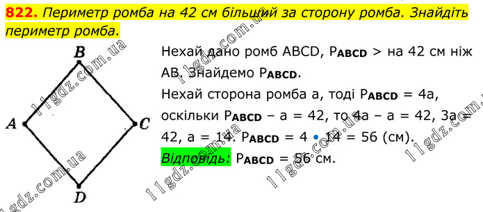 Периметр ромба на 42 см більший за сторону ромба. Знайдіть периметр ромба. Нехай дано ромб ABCD, PABCD > на 42 см ніж АВ. Знайдемо РАВСD. Нехай сторона ромба а, тоді РАВСD = 4а, оскільки PABCD – a = 42, то 4a – a = 42, 3a = 42, a = 14. PABCD = 4 • 14 = 56 (см). Відповідь: PABCD = 56 см.