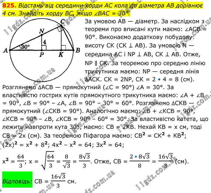 Відстань від середини хорди AC кола до діаметра AB дорівнює 4 см. Знайдіть хорду BC, якщо ∠BAC = 30°. За умовою АВ — діаметр. За наслідком з теореми про вписані кути маємо: ∠АСВ = 90°. Виконаємо додаткову побудову: висоту СК (СК ⊥ АВ). За умовою N — середина АС і NР ⊥ АВ, СК ⊥ АВ. Отже, NР ∥ СК. За теоремою про середню лінію трикутника маємо: NP — середня лінія ∆АСК. СК = 2NP, СК = 2 • 4 = 8 (см). Розглянемо ∆АСВ — прямокутний (∠С = 90°) ∠A = 30°. 3а властивістю гострих кутів прямокутного трикутника маємо: ∠А + ∠В = 90°, ∠В = 90° – ∠А, ∠В = 90° – 30° = 60°. Розглянемо ∆СКВ — прямокутний (∠СКВ = 90°). Аналогічно маємо: ∠В + ∠КСВ = 90°, ∠КСВ = 90° – ∠В, ∠KСВ = 90° – 60° = 30°. За властивістю катета, що лежить навпроти кута 30°, маємо: СВ = 2КВ. Нехай КВ = х см, тоді СВ = 2х (см). За теоремою Піфагора маємо: СВ2 = СК2 + КВ2; (2х)2 = х2 + 82; 4х2 – х2 = 64; Зх2 = 64; x2 = 64/3; x = √(64/3) = 8/√3 = (8√3)/3. Отже, СВ = (2 • 8√3)/8 = (16√3)/3 (см). Відповідь: СВ = (16√3)/3 см.