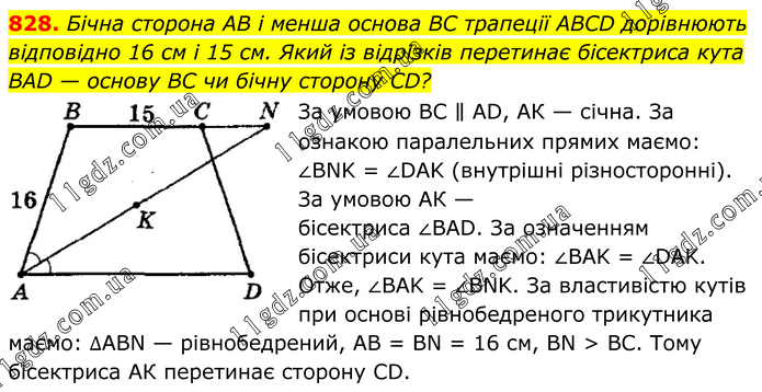 Бічна сторона AB і менша основа BC трапеції ABCD дорівнюють відповідно 16 см і 15 см. Який із відрізків перетинає бісектриса кута BAD — основу BC чи бічну сторону CD? За умовою ВС ∥ AD, АК — січна. За ознакою паралельних прямих маємо: ∠BNK = ∠DAK (внутрішні різносторонні). За умовою АК — бісектриса ∠BAD. За означенням бісектриси кута маємо: ∠BAK = ∠DAK. Отже, ∠BAK = ∠BNK. За властивістю кутів при основі рівнобедреного трикутника маємо: ∆ABN — рівнобедрений, АВ = BN = 16 см, BN > ВС. Тому бісектриса АК перетинає сторону CD.