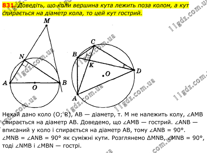 Доведіть, що коли вершина кута лежить поза колом, а кут спирається на діаметр кола, то цей кут гострий. Нехай дано коло (О; R), АВ — діаметр, т. M не належить колу, ∠АМВ спирається на діаметр АВ. Доведемо, що ∠АМВ — гострий. ∠ANВ — вписаний у коло і спирається на діаметр АВ, тому ∠АNВ = 90°. ∠МNВ = ∠АNВ = 90° як суміжні кути. Розглянемо ∆МNВ, ∠МNВ = 90°, тоді ∠NМВ і ∠МВN — гострі.