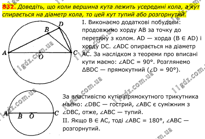 Доведіть, що коли вершина кута лежить усередині кола, а кут спирається на діаметр кола, то цей кут тупий або розгорнутий. І. Виконаємо додаткові побудови: продовжимо хорду АВ за точку до перетину з колом. АD — хорда (В ∈ АD) і хорду DС. ∠ADC опирається на діаметр АС. За наслідком з теореми про вписані кути маємо: ∠ADС = 90°. Розглянемо ∆ВDС — прямокутний (∠D = 90°). За властивістю кутів прямокутного трикутника маємо: ∠DВС — гострий, ∠АВС є суміжним з ∠DВС, отже, ∠АВС — тупий. II. Якщо В ∈ АС, тоді ∠АВС = 180°, ∠АВС — розгорнутий.