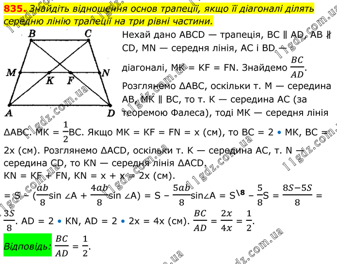 Знайдіть відношення основ трапеції, якщо її діагоналі ділять середню лінію трапеції на три рівні частини. Нехай дано АВСD — трапеція, ВС ∥ АD, АВ ∦ СD, МN — середня лінія, АС і ВD — діагоналі, MK = KF = FN. Знайдемо BC/AD. Розглянемо ∆АВС, оскільки т. M — середина АВ, МК ∥ ВС, то т. К — середина АС (за теоремою Фалеса), тоді МК — середня лінія ∆АВС. МК = 1/2ВС. Якщо МК = КF = FN = x (см), то ВС = 2 • МК, ВС = 2х (см). Розглянемо ∆АСD, оскільки т. K — середина АС, т. N — середина СD, то КN — середня лінія ∆АСD. КN = КF + FN, КN = х + х = 2х (см). S – (ab/8sin ∠A + 4ab/8sin ∠A) = S – 5ab/8sin∠A = S\8 – 5/8S = (8S-5S)/8 = 3S/8. АD = 2 • КN, АD = 2 • 2х = 4х (см). BC/AD = 2x/4x = 1/2. Відповідь: BC/AD = 1/2.