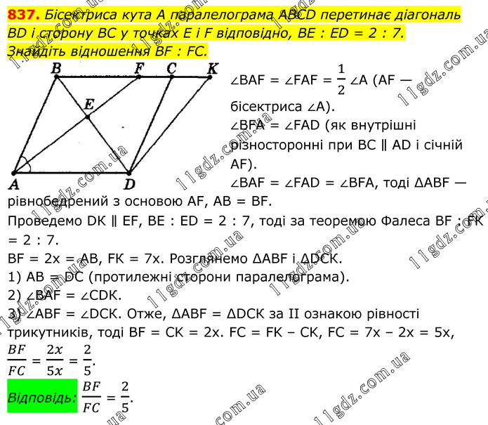 Бісектриса кута А паралелограма ABCD перетинає діагональ BD і сторону BC у точках E i F відповідно, BE : ED = 2 : 7. Знайдіть відношення BF : FC. ∠ВАF = ∠FАF = 1/2∠А (АF — бісектриса ∠А). ∠ВFА = ∠FАD (як внутрішні різносторонні при ВС ∥ АD і січній АF). ∠ВАF = ∠FАD = ∠ВFА, тоді ∆АВF — рівнобедрений з основою АF, АВ = ВF. Проведемо DК ∥ ЕF, ВЕ : ЕD = 2 : 7, тоді за теоремою Фалеса ВF : FК = 2 : 7. ВF = 2х = АВ, FК = 7х. Розглянемо ∆АВF і ∆DСК. 1) АВ = DС (протилежні сторони паралелограма). 2) ∠ВАF = ∠СDК. 3) ∠АВF = ∠DСК. Отже, ∆АВF = ∆DСК за II ознакою рівності трикутників, тоді ВF = CK = 2x. FC = FK – CK, FC = 7x – 2x = 5x, BF/FC = 2x/5x = 2/5. Відповідь: BF/FC = 2/5.