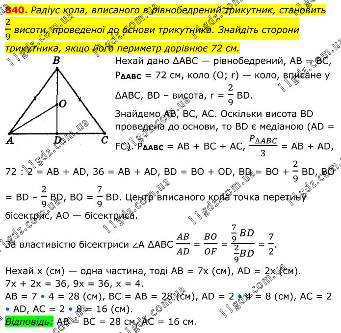 Радіус кола, вписаного в рівнобедрений трикутник, становить 2/9 висоти, проведеної до основи трикутника. Знайдіть сторони трикутника, якщо його периметр дорівнює 72 см. Нехай дано ∆АВС — рівнобедрений, АВ = ВС, Р∆АВС = 72 см, коло (О; r) — коло, вписане у ∆АВС, ВD – висота, r = 2/9 ВD. Знайдемо АВ, ВС, АС. Оскільки висота ВD проведена до основи, то ВD є медіаною (АD = FС). Р∆ABC = АВ + ВС + АС, P_∆ABC/3 = АВ + АD, 72 : 2 = АВ + АD, 36 = АВ + АD, ВD = ВО + ОD, ВD = ВО + 2/9 ВD, ВО = ВD – 2/9 ВD, ВО = 7/9 ВD. Центр вписаного кола точка перетину бісектрис, АО — бісектриса. За властивістю бісектриси ∠А ∆АВС AB/AD = BO/OF = (7/9 BD)/( 2/9 BD) = 7/2. Нехай х (см) — одна частина, тоді АВ = 7х (см), АD = 2х (см). 7х + 2х = 36, 9х = 36, х = 4. АВ = 7 • 4 = 28 (см), ВС = АВ = 28 (см), АD = 2 • 4 = 8 (см), АС = 2 • АD, АС = 2 • 8 = 16 (см). Відповідь: АВ = ВС = 28 см, АС = 16 см.