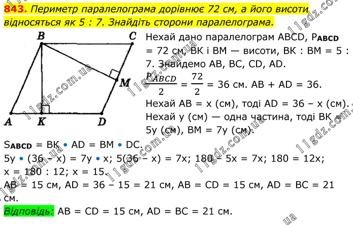 Периметр паралелограма дорівнює 72 см, а його висоти відносяться як 5 : 7. Знайдіть сторони паралелограма. Нехай дано паралелограм АВСD, РАВСD = 72 см, ВК і ВМ — висоти, ВК : ВМ = 5 : 7. Знайдемо AВ, ВС, СD, АD. P_ABCD/2 = 72/2 = 36 см. АВ + AD = 36. Нехай АВ = х (см), тоді АD = 36 – x (см). Нехай у (см) — одна частина, тоді ВК = 5у (см), ВМ = 7y (см). SABCD = ВК • АD = ВМ • DС. 5у • (36 – х) = 7у • х; 5(36 – х) = 7х; 180 – 5х = 7х; 180 = 12x; x = 180 : 12; x = 15. АВ = 15 см, АD = 36 – 15 = 21 см, АВ = СD = 15 см, АD = ВС = 21 см. Відповідь: АВ = СD = 15 см, АD = ВС = 21 см.