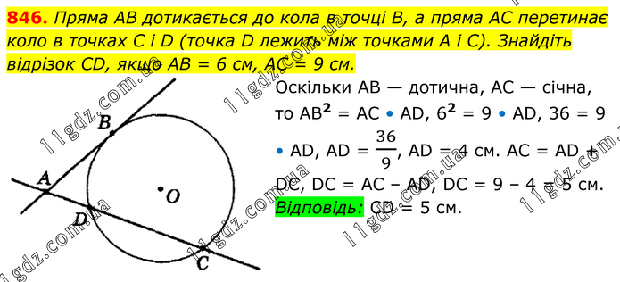 Пряма AB дотикається до кола в точці В, а пряма AC перетинає коло в точках C i D (точка D лежить між точками А і C). Знайдіть відрізок CD, якщо AB = 6 см, AC = 9 см. Оскільки АВ — дотична, АС — січна, то АВ2 = АС • АD, 62 = 9 • АD, 36 = 9 • АD, AD = 36/9, AD = 4 см. АС = АD + DС, DС = АС – АD, DС = 9 – 4 = 5 см. Відповідь: СD = 5 см.