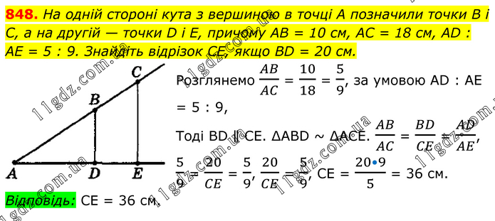 На одній стороні кута з вершиною в точці А позначили точки В і С, а на другій — точки D i E, причому AB = 10 см, AC = 18 см, AD : AE = 5 : 9. Знайдіть відрізок CE, якщо BD = 20 см. Розглянемо AB/AC = 10/18 = 5/9, за умовою AD : AE = 5 : 9, Тоді BD ∥ CE. ∆ABD ~ ∆ACE. AB/AC = BD/CE = AD/AE, 5/9 = 20/CE = 5/9, 20/CE = 5/9, CE = (20•9)/5 = 36 см. Відповідь: СЕ = 36 см.