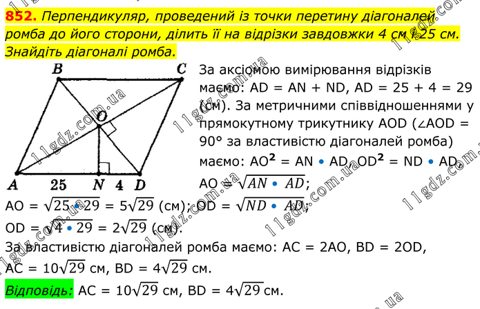 Перпендикуляр, проведений із точки перетину діагоналей ромба до його сторони, ділить її на відрізки завдовжки 4 см і 25 см. Знайдіть діагоналі ромба. За аксіомою вимірювання відрізків маємо: АD = АN + ND, АD = 25 + 4 = 29 (см). За метричними співвідношеннями у прямокутному трикутнику АОD (∠AOD = 90° за властивістю діагоналей ромба) маємо: АО2 = АN • АD, OD2 = ND • АD, АO = √(AN• AD); АО = √(25•29) = 5√29 (см); OD = √(ND• AD); OD = √(4•29) = 2√29 (см). За властивістю діагоналей ромба маємо: АС = 2АО, ВD = 2OD, АС = 10√29 см, ВD = 4√29 см. Відповідь: АС = 10√29 см, ВD = 4√(29 )см.