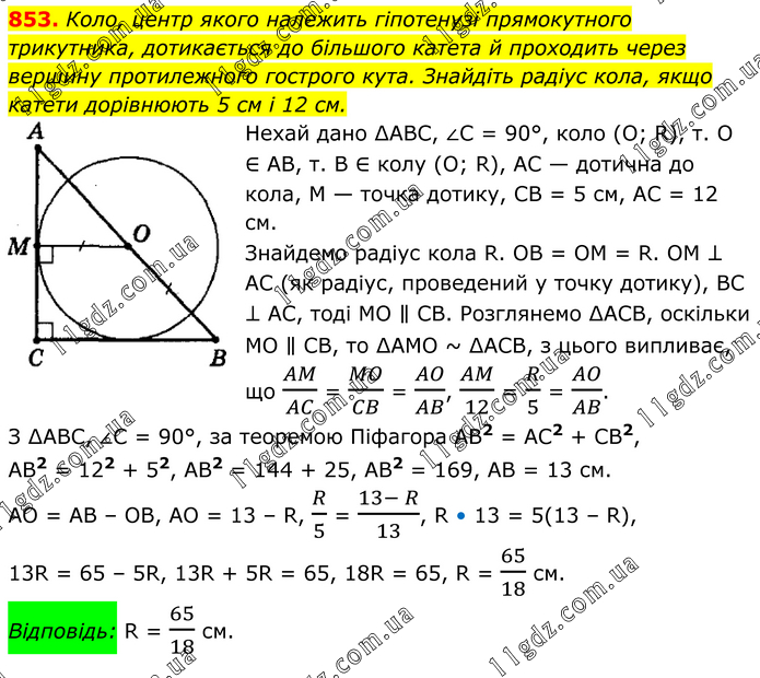 Коло, центр якого належить гіпотенузі прямокутного трикутника, дотикається до більшого катета й проходить через вершину протилежного гострого кута. Знайдіть радіус кола, якщо катети дорівнюють 5 см і 12 см. Нехай дано ∆АВС, ∠C = 90°, коло (О; R), т. О ∈ АВ, т. В ∈ колу (О; R), АС — дотична до кола, M — точка дотику, СВ = 5 см, АС = 12 см. Знайдемо радіус кола R. ОВ = ОМ = R. ОМ ⊥ АС (як радіус, проведений у точку дотику), ВС ⊥ АС, тоді МО ∥ СВ. Розглянемо ∆АСВ, оскільки МО ∥ СВ, то ∆АМО ~ ∆АСВ, з цього випливає, що AM/AC = MO/CB = AO/AB, AM/12 = R/5 = AO/AB. З ∆АВС, ∠C = 90°, за теоремою Піфагора АВ2 = AC2 + CB2, AB2 = 122 + 52, АВ2 = 144 + 25, АВ2 = 169, АВ = 13 см. АО = АВ – ОВ, АО = 13 – R, R/5 = (13- R)/13, R • 13 = 5(13 – R), 13R = 65 – 5R, 13R + 5R = 65, 18R = 65, R = 65/18 см. Відповідь: R = 65/18 см.