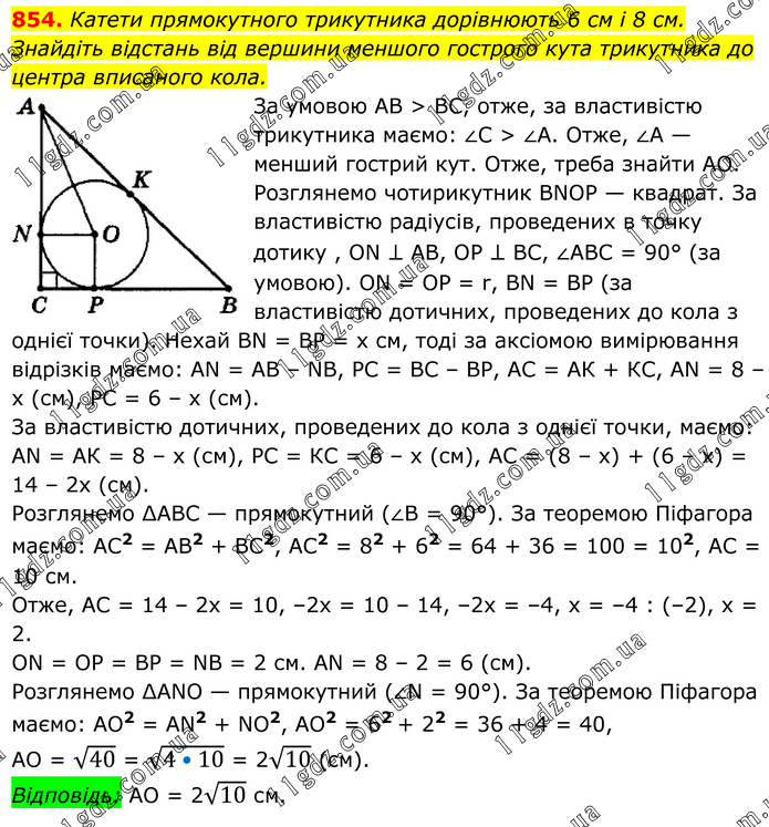 Катети прямокутного трикутника дорівнюють 6 см і 8 см. Знайдіть відстань від вершини меншого гострого кута трикутника до центра вписаного кола. За умовою АВ > ВС, отже, за властивістю трикутника маємо: ∠C > ∠A. Отже, ∠A — менший гострий кут. Отже, треба знайти АО. Розглянемо чотирикутник ВNОР — квадрат. За властивістю радіусів, проведених в точку дотику , ОN ⊥ АВ, ОР ⊥ ВС, ∠ABC = 90° (за умовою). ОN = ОР = r, ВN = ВР (за властивістю дотичних, проведених до кола з однієї точки). Нехай ВN = ВР = х см, тоді за аксіомою вимірювання відрізків маємо: АN = АВ – NВ, РС = ВС – ВР, АС = АК + КС, АN = 8 – х (см), РС = 6 – x (см). За властивістю дотичних, проведених до кола з однієї точки, маємо: АN = АК = 8 – x (см), РС = КС = 6 – x (см), АС = (8 – х) + (6 – х) = 14 – 2х (см). Розглянемо ∆АВС — прямокутний (∠В = 90°). За теоремою Піфагора маємо: АС2 = АВ2 + ВС2, АС2 = 82 + 62 = 64 + 36 = 100 = 102, АС = 10 см. Отже, АС = 14 – 2х = 10, –2х = 10 – 14, –2х = –4, x = –4 : (–2), х = 2. ОN = ОР = ВР = NВ = 2 см. АN = 8 – 2 = 6 (см). Розглянемо ∆АNО — прямокутний (∠N = 90°). За теоремою Піфагора маємо: АО2 = АN2 + NO2, АО2 = 62 + 22 = 36 + 4 = 40, АО = √40 = √(4•10) = 2√10 (см). Відповідь: АО = 2√10 см.
