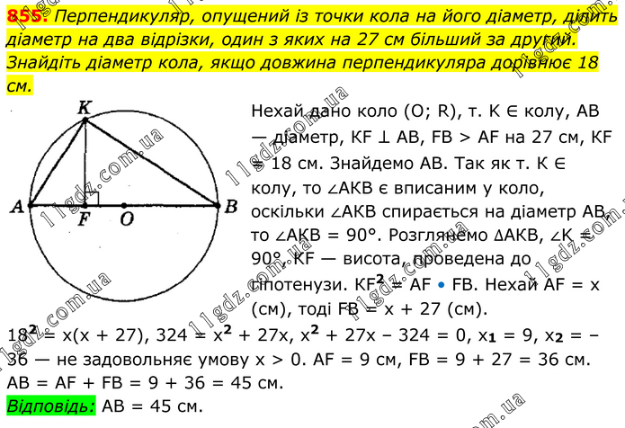 Перпендикуляр, опущений із точки кола на його діаметр, ділить діаметр на два відрізки, один з яких на 27 см більший за другий. Знайдіть діаметр кола, якщо довжина перпендикуляра дорівнює 18 см. Нехай дано коло (О; R), т. K ∈ колу, АВ — діаметр, КF ⊥ АВ, FВ > АF на 27 см, КF = 18 см. Знайдемо АВ. Так як т. К ∈ колу, то ∠АКВ є вписаним у коло, оскільки ∠АКВ спирається на діаметр АВ, то ∠АКВ = 90°. Розглянемо ∆АКВ, ∠K = 90°, КF — висота, проведена до гіпотенузи. КF2 = АF • FВ. Нехай АF = х (см), тоді FВ = х + 27 (см). 182 = х(х + 27), 324 = х2 + 27х, х2 + 27х – 324 = 0, х1 = 9, х2 = –36 — не задовольняє умову х > 0. АF = 9 см, FВ = 9 + 27 = 36 см. АВ = АF + FВ = 9 + 36 = 45 см. Відповідь: АВ = 45 см.