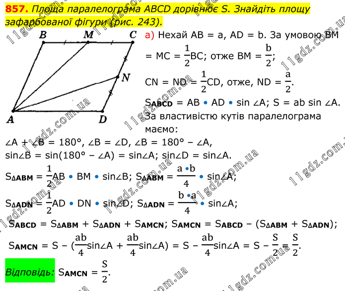 Площа паралелограма ABCD дорівнює S. Знайдіть площу зафарбованої фігури (рис. 243). а) Нехай АВ = a, AD = b. За умовою ВМ = MC = 1/2BC; отже BM = b/2; CN = ND = 1/2CD, отже, ND = a/2. SABCD = АВ • AD • sin ∠A; S = ab sin ∠А. За властивістю кутів паралелограма маємо: ∠A + ∠В = 180°, ∠В = ∠D, ∠В = 180° – ∠А, sin∠B = sin(180° – ∠A) = sin∠A; sin∠D = sin∠A. S∆ABM = 1/2AB • BM • sin∠B; S∆ABM = (a •b)/4 • sin∠A; S∆ADN = 1/2AD • DN • sin∠D; S∆ADN = (b •a)/4 • sin∠A; SABCD = S∆ABM + S∆ADN + SAMCN; SAMCN = SABCD – (S∆ABM + S∆ADN); SAMCN = S – (ab/4sin∠A + ab/4sin∠A) = S – ab/4sin∠A = S – S/2 = S/2. Відповідь: SAMCN = S/2.