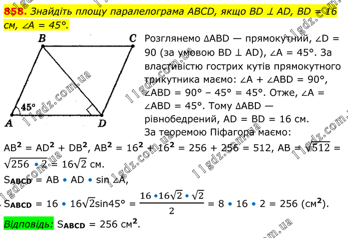 Знайдіть площу паралелограма ABCD, якщо BD ⊥ AD, BD = 16 см, ∠A = 45°. Розглянемо ∆ABD — прямокутний, ∠D = 90 (за умовою BD ⊥ AD), ∠A = 45°. За властивістю гострих кутів прямокутного трикутника маємо: ∠A + ∠ABD = 90°, ∠ABD = 90° – 45° = 45°. Отже, ∠A = ∠ABD = 45°. Тому ∆ABD — рівнобедрений, AD = BD = 16 см. За теоремою Піфагора маємо: AB2 = AD2 + DB2, AB2 = 162 + 162 = 256 + 256 = 512, AB = √512 = √(256 •2) = 16√2 см. SABCD = AB • AD • sin ∠A, SABCD = 16 • 16√2sin45° = (16 •16√2 • √2)/2 = 8 • 16 • 2 = 256 (см2). Відповідь: SABCD = 256 cм2.