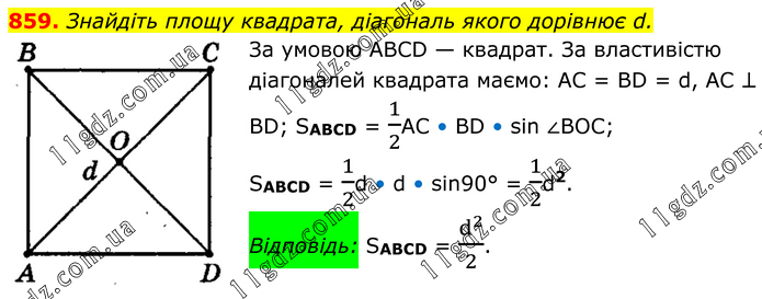 Знайдіть площу квадрата, діагональ якого дорівнює d. За умовою АВСD — квадрат. За властивістю діагоналей квадрата маємо: АС = ВD = d, АС ⊥ BD; SABCD = 1/2АС • BD • sin ∠BOC; SABCD = 1/2d • d • sin90° = 1/2d2. Відповідь: SABCD = d^2/2.