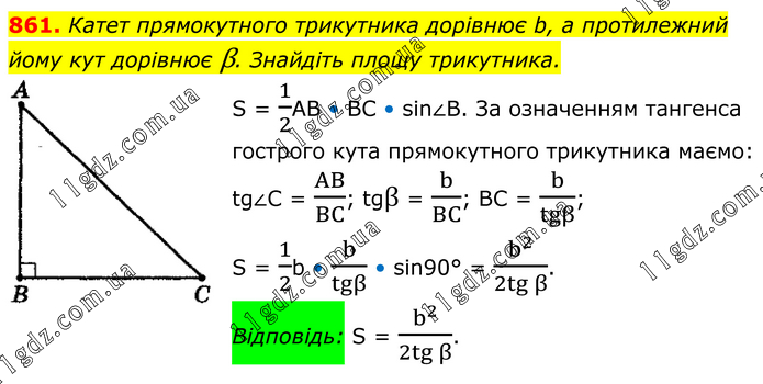 Катет прямокутного трикутника дорівнює b, а протилежний йому кут дорівнює β. Знайдіть площу трикутника. S = 1/2АВ • ВС • sin∠B. За означенням тангенса гострого кута прямокутного трикутника маємо: tg∠C = AB/BC; tgβ = b/BC; BC = b/tgβ; S = 1/2b • b/tgβ • sin90° = b^2/(2tg β). Відповідь: S = b^2/(2tg β).