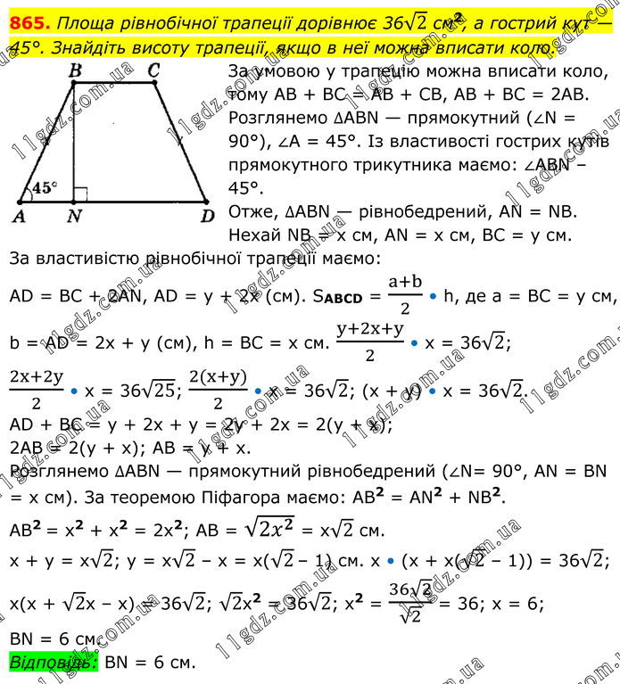 Площа рівнобічної трапеції дорівнює 36√2 см2, а гострий кут — 45°. Знайдіть висоту трапеції, якщо в неї можна вписати коло. За умовою у трапецію можна вписати коло, тому АВ + ВС = АВ + СВ, АВ + ВС = 2АВ. Розглянемо ∆АBN — прямокутний (∠N = 90°), ∠А = 45°. Із властивості гострих кутів прямокутного трикутника маємо: ∠АВN – 45°. Отже, ∆АBN — рівнобедрений, АN = NB. Нехай NВ = х см, АN = х см, ВС = у см. За властивістю рівнобічної трапеції маємо: AD = BC + 2AN, AD = y + 2x (см). SABCD = (a+b)/2 • h, де а = ВС = у см, b = AD = 2x + y (см), h = BC = x см. (y+2x+y)/2 • x = 36√2; (2x+2y)/2 • x = 36√25; (2(x+y))/2 • x = 36√2; (x + y) • x = 36√2. АD + ВС = у + 2х + у = 2у + 2х = 2(у + х); 2АВ = 2(у + х); АВ = у + x. Розглянемо ∆АВN — прямокутний рівнобедрений (∠N= 90°, АN = ВN = х см). За теоремою Піфагора маємо: АВ2 = АN2 + NВ2. АВ2 = х2 + х2 = 2х2; АВ = √(2x^2 ) = x√2 см. х + у = x√2; у = x√2 – х = х(√2 – 1) см. х • (х + х(√2 – 1)) = 36√2; х(x + √2x – x) = 36√2; √2x2 = 36√2; х2 = (36√2)/√2 = 36; x = 6; BN = 6 см. Відповідь: ВN = 6 см.
