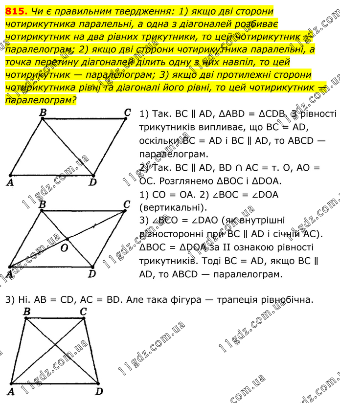 Чи є правильним твердження: 1) якщо дві сторони чотирикутника паралельні, а одна з діагоналей розбиває чотирикутник на два рівних трикутники, то цей чотирикутник — паралелограм; 2) якщо дві сторони чотирикутника паралельні, а точка перетину діагоналей ділить одну з них навпіл, то цей чотирикутник — паралелограм; 3) якщо дві протилежні сторони чотирикутника рівні та діагоналі його рівні, то цей чотирикутник — паралелограм? 1) Так. ВС ∥ AD, ∆ABD = ∆CDB. З рівності трикутників випливає, що ВС = AD, оскільки ВС = AD і ВС ∥ AD, то ABCD — паралелограм. 2) Так. ВС ∥ AD, BD ∩ АС = т. О, АО = ОС. Розглянемо ∆ВОС і ∆DOA. 1) CO = ОА. 2) ∠BOC = ∠DOA (вертикальні). 3) ∠BCO = ∠DAO (як внутрішні різносторонні при ВС ∥ AD і січній АС). ∆ВОС = ∆DOA за II ознакою рівності трикутників. Тоді ВС = AD, якщо ВС ∥ AD, то ABCD — паралелограм. 3) Ні. AB = CD, AC = BD. Але така фігура — трапеція рівнобічна.