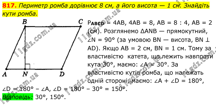 Периметр ромба дорівнює 8 см, а його висота — 1 см. Знайдіть кути ромба. PABCD = 4АВ, 4АВ = 8, AB = 8 : 4, AB = 2 (см). Розглянемо ∆АNВ — прямокутний, ∠N = 90° (за умовою ВN — висота, ВN ⊥ АD). Якщо АВ = 2 см, ВN = 1 см. Тому за властивістю катета, що лежить навпроти кута 30°, маємо: ∠А = 30°. За властивістю кутів ромба, що належать одній стороні, маємо: ∠А + ∠D = 180°, ∠D = 180° – ∠А, ∠D = 180° – 30° = 150°. Відповідь: 30°, 150°.
