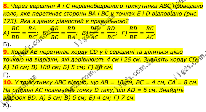 8. Через вершини A i C нерівнобедреного трикутника ABC проведено коло, яке перетинає сторони BA і BC у точках E i D відповідно (рис. 173). Яка з даних рівностей є правильною? А) BC/BD = BA/BC; Б) BE/BC = BD/BA; В) DE/AC = BD/BC; Г) BD/BE = BC/AC. Б). 9. Хорда AB перетинає хорду CD у її середині та ділиться цією точкою на відрізки, які дорівнюють 4 см і 25 см. Знайдіть хорду CD. А) 10 см; В) 100 см; Б) 5 см; Г) 20 см. Г). 10. У трикутнику ABC відомо, що AB = 10 см, BC = 4 см, CA = 8 см. На стороні AC позначено точку D таку, що AD = б см. Знайдіть відрізок BD. А) 5 см; В) б см; Б) 4 см; Г) 7 см. А).