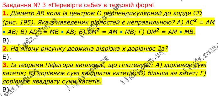 Завдання № 3 «Перевірте себе» в тестовій формі 1. Діаметр AB кола із центром O перпендикулярний до хорди CD (рис. 195). Яка з наведених рівностей є неправильною? А) AC2 = AM • AB; В) AD2 = MB • AB; Б) CM2 = AM • MB; Г) DM2 = AM • MB. B). 2. На якому рисунку довжина відрізка х дорівнює 2а? Б). 3. Із теореми Піфагора випливає, що гіпотенуза: A) дорівнює сумі катетів; Б) дорівнює сумі квадратів катетів; B) більша за катет; Г) дорівнює квадрату суми катетів. В).