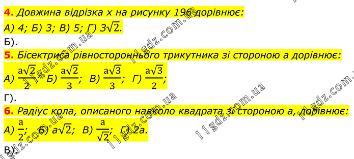 4. Довжина відрізка х на рисунку 196 дорівнює: А) 4; Б) 3; В) 5; Г) З√2. Б). 5. Бісектриса рівностороннього трикутника зі стороною а дорівнює: А) (а√2)/2; Б) (а√2)/3; В) (а√3)/3; Г) (а√3)/2; Г). 6. Радіус кола, описаного навколо квадрата зі стороною а, дорівнює: А) а/2; Б) а√2; В) а/√2; Г) 2а. В).