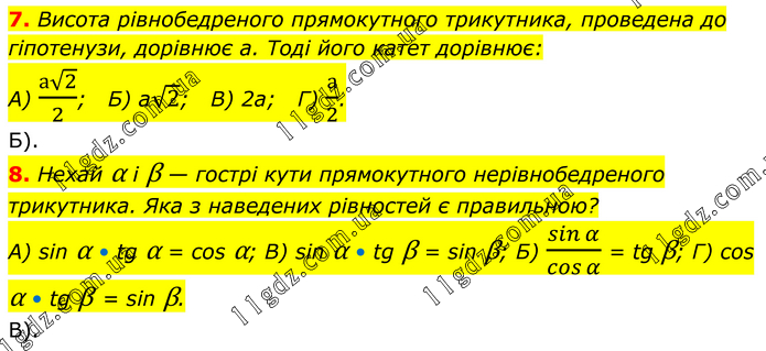 7. Висота рівнобедреного прямокутного трикутника, проведена до гіпотенузи, дорівнює а. Тоді його катет дорівнює: А) (а√2)/2; Б) а√2; В) 2а; Г) а/2. Б). 8. Нехай α і β — гострі кути прямокутного нерівнобедреного трикутника. Яка з наведених рівностей є правильною? A) sin α • tg α = cos α; В) sin α • tg β = sin β; Б) sinα/cosα = tg β; Г) cos α • tg β = sin β. B).