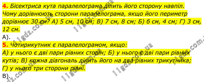 4. Бісектриса кута паралелограма ділить його сторону навпіл. Чому дорівнюють сторони паралелограма, якщо його периметр дорівнює 30 см? А) 5 см, 10 см; В) 7 см, 8 см; Б) б см, 4 см; Г) 3 см, 12 см. А). 5. Чотирикутник є паралелограмом, якщо: A) у нього є дві пари рівних сторін; Б) у нього є дві пари рівних кутів; B) кожна діагональ ділить його на два рівних трикутника; Г) у нього три сторони рівні. В).