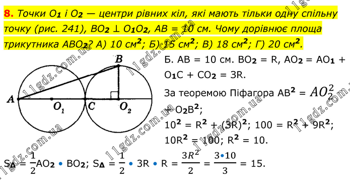 Точки O1 і O2 — центри рівних кіл, які мають тільки одну спільну точку (рис. 241), BO2 ⊥ O1O2, AB = 10 см. Чому дорівнює площа трикутника ABO2? А) 10 см2; Б) 15 см2; В) 18 см2; Г) 20 см2. Б. АВ = 10 см. ВО2 = R, АО2 = АО1 + O1C + СO2 = ЗR. За теоремою Піфагора АВ2 = 〖AO〗_2^2 + O2В2; 102 = R2 + (ЗR)2; 100 = R2 + 9R2; 10R2 = 100; R2 = 10. S∆ = 1/2АO2 • ВO2; S∆ = 1/2 • 3R • R = (3R^2)/2 = (3•10)/3 = 15.