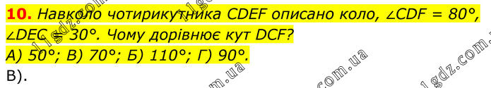 10. Навколо чотирикутника CDEF описано коло, ∠CDF = 80°, ∠DEC = 30°. Чому дорівнює кут DCF? А) 50°; В) 70°; Б) 110°; Г) 90°. В).