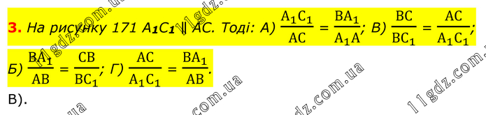 3. На рисунку 171 A1C1 ∥ AC. Тоді: А) (А_1 С_1)/АС = (ВА_1)/(А_1 А); В) ВС/(ВС_1 ) = АС/(А_1 С_1 ); Б) (ВА_1)/АВ = СВ/(ВС_1 ); Г) АС/(А_1 С_1 ) = (ВА_1)/АВ. В).
