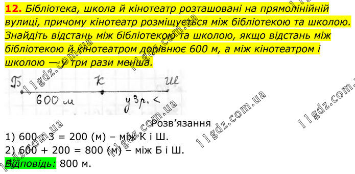 12. Бібліотека, школа й кінотеатр розташовані на прямолінійній вулиці, причому кінотеатр розміщується між бібліотекою та школою. Знайдіть відстань між бібліотекою та школою, якщо відстань між бібліотекою й кінотеатром дорівнює 600 м, а між кінотеатром і школою — у три рази менша. Розв’язання 1) 600 : 3 = 200 (м) – між К і Ш. 2) 600 + 200 = 800 (м) – між Б і Ш. Відповідь: 800 м.