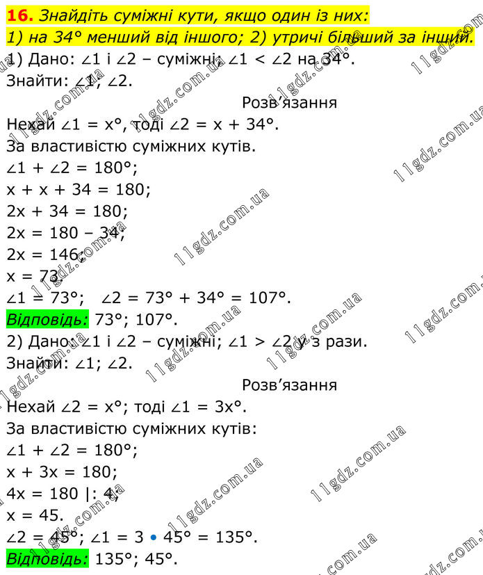 16. Знайдіть суміжні кути, якщо один із них: 1) на 34° менший від іншого; 2) утричі більший за інший. 1) Дано: ∠1 і ∠2 – суміжні; ∠1 < ∠2 на 34°. Знайти: ∠1; ∠2. Розв’язання Нехай ∠1 = х°, тоді ∠2 = х + 34°. За властивістю суміжних кутів. ∠1 + ∠2 = 180°; х + х + 34 = 180; 2х + 34 = 180; 2х = 180 – 34; 2х = 146; х = 73. ∠1 = 73°; ∠2 = 73° + 34° = 107°. Відповідь: 73°; 107°. 2) Дано: ∠1 і ∠2 – суміжні; ∠1 > ∠2 у з рази. Знайти: ∠1; ∠2. Розв’язання Нехай ∠2 = х°; тоді ∠1 = 3х°. За властивістю суміжних кутів: ∠1 + ∠2 = 180°; х + 3х = 180; 4х = 180 |: 4; х = 45. ∠2 = 45°; ∠1 = 3 • 45° = 135°. Відповідь: 135°; 45°.