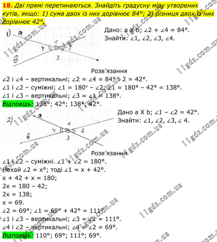 18. Дві прямі перетинаються. Знайдіть градусну міру утворених кутів, якщо: 1) сума двох із них дорівнює 84°; 2) різниця двох із них дорівнює 42°. Дано: a X b; ∠2 + ∠4 = 84°. Знайти: ∠1, ∠2, ∠3, ∠4. Розв’язання ∠2 і ∠4 – вертикальні; ∠2 = ∠4 = 84° : 2 = 42°. ∠1 і ∠2 – суміжні; ∠1 = 180° – ∠2; ∠1 = 180° – 42° = 138°. ∠1 і ∠3 – вертикальні; ∠3 = ∠1 = 138°. Відповідь: 138°; 42°; 138°; 42°. Дано a X b; ∠1 – ∠2 = 42°. Знайти: ∠1, ∠2, ∠3, ∠ 4. Розв’язання ∠1 і ∠2 – суміжні. ∠1 + ∠2 = 180°. Нехай ∠2 = х°; тоді ∠1 = х + 42°. х + 42 + х = 180; 2х = 180 – 42; 2х = 138; х = 69. ∠2 = 69°; ∠1 = 69° + 42° = 111°. ∠1 і ∠3 – вертикальні; ∠3 = ∠1 = 111°. ∠4 і ∠2 – вертикальні; ∠4 = ∠2 = 69°. Відповідь: 110°; 69°; 111°; 69°.