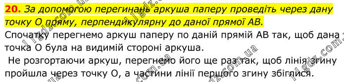 20. За допомогою перегинань аркуша паперу проведіть через дану точку O пряму, перпендикулярну до даної прямої AB. Спочатку перегнемо аркуш паперу по даній прямій АВ так, щоб дана точка О була на видимій стороні аркуша. Не розгортаючи аркуш, перегнемо його ще раз так, щоб лінія згину пройшла через точку О, а частини лінії першого згину збіглися.
