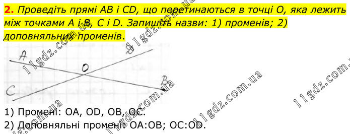 2. Проведіть прямі AB і CD, що перетинаються в точці О, яка лежить між точками А і В, C і D. Запишіть назви: 1) променів; 2) доповняльних променів. 1) Промені: ОА, ОD, OB, OC. 2) Доповняльні промені: ОА:ОВ; OC:OD.