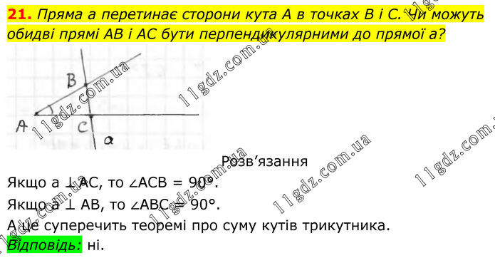 21. Пряма а перетинає сторони кута А в точках В і С. Чи можуть обидві прямі AB і AC бути перпендикулярними до прямої а? Розв’язання Якщо а ⊥ АС, то ∠АСВ = 90°. Якщо а ⊥ АВ, то ∠АВС = 90°. А це суперечить теоремі про суму кутів трикутника. Відповідь: ні.