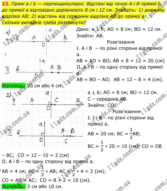 22. Прямі а і b — перпендикулярні. Відстані від точок А і В прямої b до прямої а відповідно дорівнюють 8 см і 12 см. Знайдіть: 1) довжину відрізка AB; 2) відстань від середини відрізка AB до прямої а. Скільки випадків треба розглянути? Дано: а ⊥ b; АО = 8 см; ВО = 12 см. Знайти: АВ. Розв’язання І. А і В – по різні сторони від прямої а. АВ = АО + ВО; АВ = 8 + 12 = 20 (см) ІІ. А і В – по одну сторону від прямої а. АВ = ВО – АО; АВ = 12 – 8 = 4 (см). Відповідь: 20 см або 4 см. a ⊥ b; АО = 8 см; ВО = 12 см. С – середина АВ. Знайти: СО. Розв’язання І. І і В – по різні сторони від прямої а. АВ = 20 см; ВС = 1/2АВ; ВС = 1/2 • 20 = 10 (см); СО = ОВ – ВС; СО = 12 – 10 = 2 (см) ІІ. А і В – по одну сторону від прямої а. АВ = 4 см; АС = 1/2 • АВ; АС = 1/2 • 4 = 2 (см); СО = АО + АС; СО = 8 + 2 = 10 (см). Відповідь: 2 см або 10 см.
