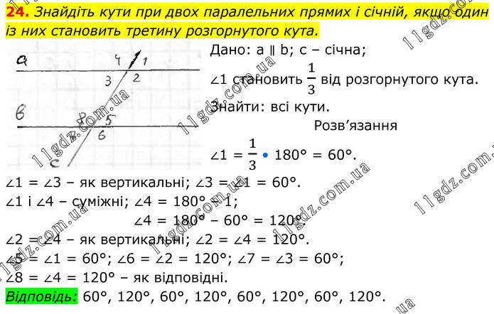 24. Знайдіть кути при двох паралельних прямих і січній, якщо один із них становить третину розгорнутого кута. Дано: a ∥ b; с – січна; ∠1 становить 1/3 від розгорнутого кута. Знайти: всі кути. Розв’язання ∠1 = 1/3 • 180° = 60°. ∠1 = ∠3 – як вертикальні; ∠3 = ∠1 = 60°. ∠1 і ∠4 – суміжні; ∠4 = 180° – 1; ∠4 = 180° – 60° = 120°. ∠2 = ∠4 – як вертикальні; ∠2 = ∠4 = 120°. ∠5 = ∠1 = 60°; ∠6 = ∠2 = 120°; ∠7 = ∠3 = 60°; ∠8 = ∠4 = 120° – як відповідні. Відповідь: 60°, 120°, 60°, 120°, 60°, 120°, 60°, 120°.