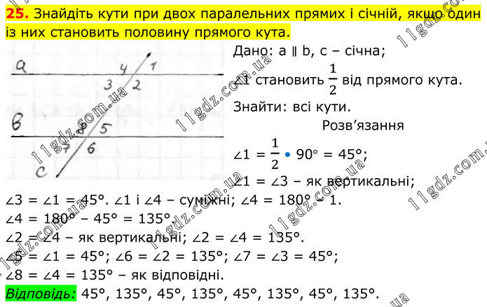 25. Знайдіть кути при двох паралельних прямих і січній, якщо один із них становить половину прямого кута. Дано: a ∥ b, с – січна; ∠1 становить 1/2 від прямого кута. Знайти: всі кути. Розв’язання ∠1 = 1/2 • 90° = 45°; ∠1 = ∠3 – як вертикальні; ∠3 = ∠1 = 45°. ∠1 і ∠4 – суміжні; ∠4 = 180° – 1. ∠4 = 180° – 45° = 135°. ∠2 = ∠4 – як вертикальні; ∠2 = ∠4 = 135°. ∠5 = ∠1 = 45°; ∠6 = ∠2 = 135°; ∠7 = ∠3 = 45°; ∠8 = ∠4 = 135° – як відповідні. Відповідь: 45°, 135°, 45°, 135°, 45°, 135°, 45°, 135°.