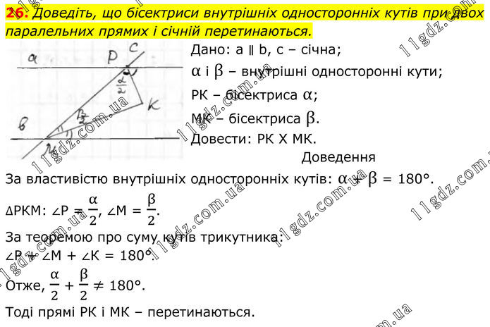 26. Доведіть, що бісектриси внутрішніх односторонніх кутів при двох паралельних прямих і січній перетинаються. Дано: a ∥ b, с – січна; α і β – внутрішні односторонні кути; РК – бісектриса α; МК – бісектриса β. Довести: РК Х МК. Доведення За властивістю внутрішніх односторонніх кутів: α + β = 180°. ∆РКМ: ∠Р = α/2, ∠М = β/2. За теоремою про суму кутів трикутника: ∠Р + ∠М + ∠К = 180°. Отже, α/2 + β/2 ≠ 180°. Тоді прямі РК і МК – перетинаються.