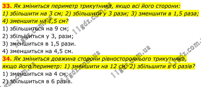 33. Як зміниться периметр трикутника, якщо всі його сторони: 1) збільшити на 3 см; 2) збільшити у 3 рази; 3) зменшити в 1,5 раза; 4) зменшити на 1,5 см? 1) збільшиться на 9 см; 2) збільшиться у 3, рази; 3) зменшиться в 1,5 рази. 4) зменшиться на 4,5 см. 34. Як зміниться довжина сторони рівностороннього трикутника, якщо його периметр: 1) зменшити на 12 см; 2) збільшити в б разів? 1) зменшиться на 4 см; 2) збільшиться в 6 разів.