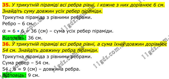 35. У трикутній піраміді всі ребра рівні, і кожне з них дорівнює 6 см. Знайдіть суму довжин усіх ребер піраміди. Трикутна піраміда з рівними ребрами. Ребро – 6 см. α = 6 • 6 = 36 (см) – сума усіх ребер піраміди. Відповідь: 36 см. 36. У трикутній піраміді всі ребра рівні, а сума їхніх довжин дорівнює 54 см. Знайдіть довжину ребра піраміди. Трикутна піраміда з рівними ребрами. Сума ребер – 54 см. 54 : 6 = 9 (см) – довжина ребра. Відповідь: 9 см.