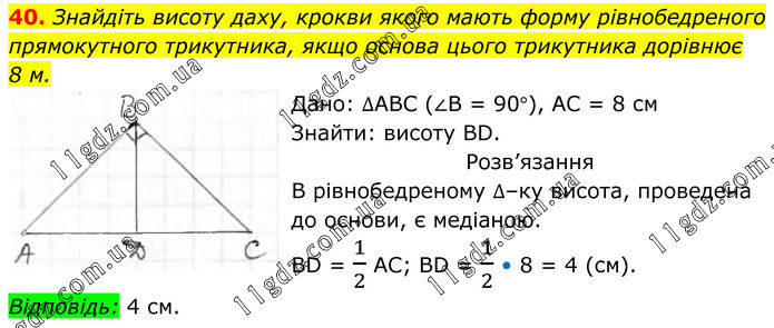 40. Знайдіть висоту даху, крокви якого мають форму рівнобедреного прямокутного трикутника, якщо основа цього трикутника дорівнює 8 м. Дано: ∆АВС (∠В = 90°), АС = 8 см Знайти: висоту BD. Розв’язання В рівнобедреному ∆–ку висота, проведена до основи, є медіаною. BD = 1/2 AC; BD = 1/2 • 8 = 4 (см). Відповідь: 4 см.