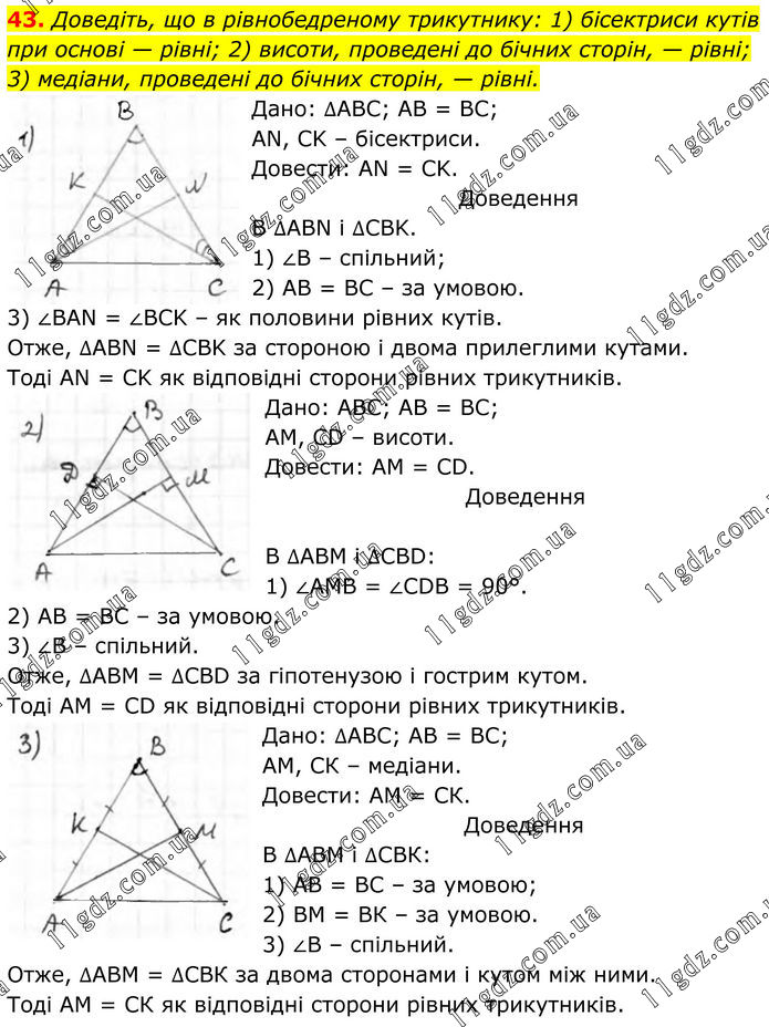 43. Доведіть, що в рівнобедреному трикутнику: 1) бісектриси кутів при основі — рівні; 2) висоти, проведені до бічних сторін, — рівні; 3) медіани, проведені до бічних сторін, — рівні. Дано: ∆АВС; АВ = ВС; AN, CK – бісектриси. Довести: AN = CK. Доведення В ∆ABN i ∆CBK. 1) ∠B – спільний; 2) АВ = ВС – за умовою. 3) ∠BAN = ∠BCK – як половини рівних кутів. Отже, ∆ABN = ∆CBK за стороною і двома прилеглими кутами. Тоді AN = CK як відповідні сторони рівних трикутників. Дано: АВС; АВ = ВС; АМ, CD – висоти. Довести: АМ = CD. Доведення В ∆ABM i ∆CBD: 1) ∠AMB = ∠CDB = 90°. 2) AB = BC – за умовою. 3) ∠В – спільний. Отже, ∆АВМ = ∆CBD за гіпотенузою і гострим кутом. Тоді АМ = CD як відповідні сторони рівних трикутників. Дано: ∆АВС; АВ = ВС; АМ, СК – медіани. Довести: АМ = СК. Доведення В ∆АВМ і ∆СВК: 1) АВ = ВС – за умовою; 2) ВМ = ВК – за умовою. 3) ∠В – спільний. Отже, ∆АВМ = ∆СВК за двома сторонами і кутом між ними. Тоді АМ = СК як відповідні сторони рівних трикутників.