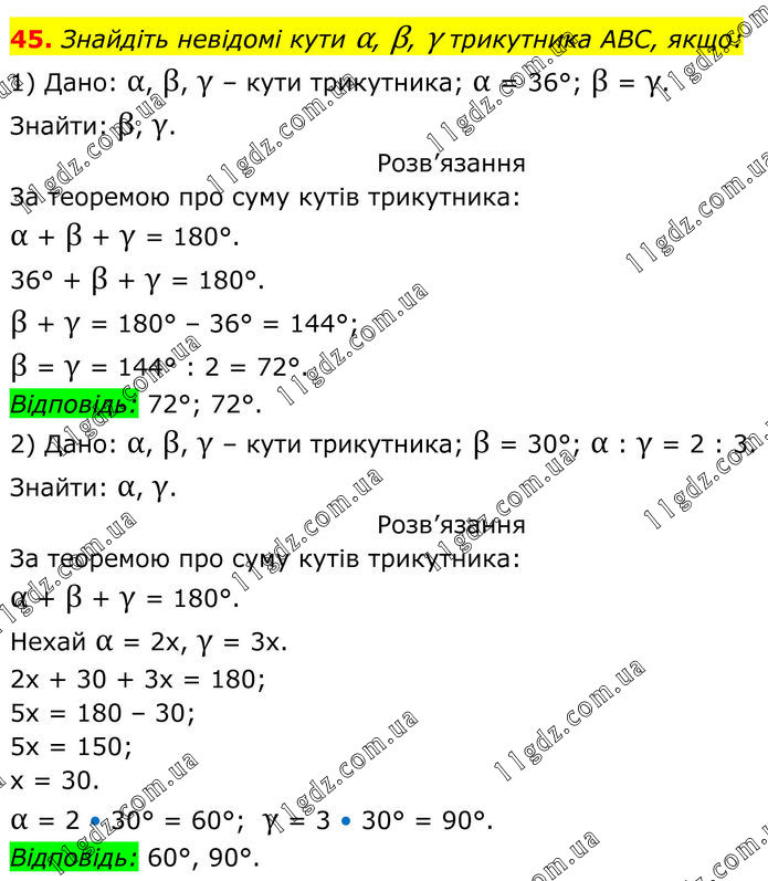 45. Знайдіть невідомі кути α, β, γ трикутника АВС, якщо: 1) Дано: α, β, γ – кути трикутника; α = 36°; β = γ. Знайти: β, γ. Розв’язання За теоремою про суму кутів трикутника: α + β + γ = 180°. 36° + β + γ = 180°. β + γ = 180° – 36° = 144°; β = γ = 144° : 2 = 72°. Відповідь: 72°; 72°. 2) Дано: α, β, γ – кути трикутника; β = 30°; α : γ = 2 : 3. Знайти: α, γ. Розв’язання За теоремою про суму кутів трикутника: α + β + γ = 180°. Нехай α = 2х, γ = 3х. 2x + 30 + 3x = 180; 5x = 180 – 30; 5x = 150; x = 30. α = 2 • 30° = 60°; γ = 3 • 30° = 90°. Відповідь: 60°, 90°.
