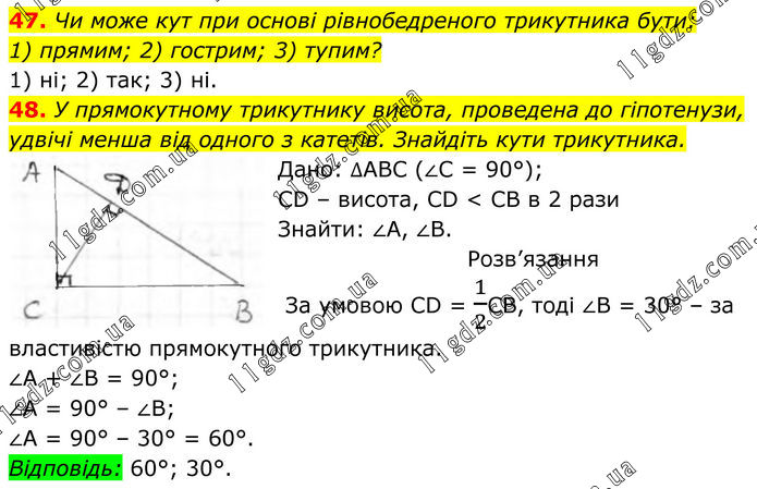 47. Чи може кут при основі рівнобедреного трикутника бути: 1) прямим; 2) гострим; 3) тупим? 1) ні; 2) так; 3) ні. 48. У прямокутному трикутнику висота, проведена до гіпотенузи, удвічі менша від одного з катетів. Знайдіть кути трикутника. Дано: ∆АВС (∠С = 90°); CD – висота, CD < CB в 2 рази Знайти: ∠А, ∠В. Розв’язання За умовою CD = 1/2CB, тоді ∠В = 30° – за властивістю прямокутного трикутника. ∠А + ∠В = 90°; ∠А = 90° – ∠В; ∠А = 90° – 30° = 60°. Відповідь: 60°; 30°.