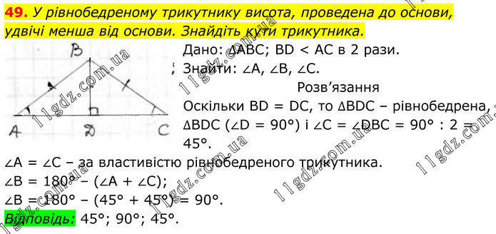 49. У рівнобедреному трикутнику висота, проведена до основи, удвічі менша від основи. Знайдіть кути трикутника. Дано: ∆АВС; BD < AC в 2 рази. Знайти: ∠А, ∠В, ∠С. Розв’язання Оскільки BD = DC, то ∆BDC – рівнобедрена, ∆BDC (∠D = 90°) і ∠С = ∠DBC = 90° : 2 = 45°. ∠A = ∠C – за властивістю рівнобедреного трикутника. ∠В = 180° – (∠А + ∠С); ∠В = 180° – (45° + 45°) = 90°. Відповідь: 45°; 90°; 45°.