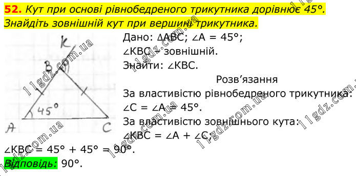 52. Кут при основі рівнобедреного трикутника дорівнює 45°. Знайдіть зовнішній кут при вершині трикутника. Дано: ∆АВС; ∠А = 45°; ∠КВС – зовнішній. Знайти: ∠КВС. Розв’язання За властивістю рівнобедреного трикутника: ∠С = ∠А = 45°. За властивістю зовнішнього кута: ∠КВС = ∠А + ∠С; ∠КВС = 45° + 45° = 90°. Відповідь: 90°.